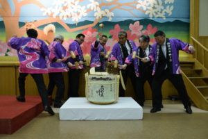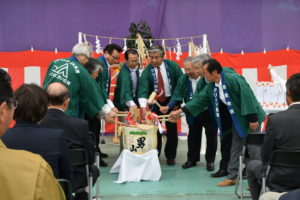 新年交礼会における樽酒の鏡割りです。動きがありますが、何を避けているのでしょうか?