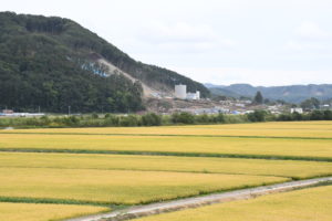背景の山腹の地滑り跡は、2018年9月6日未明に北海道胆振東部地域を震源として発生した震災の爪痕です。